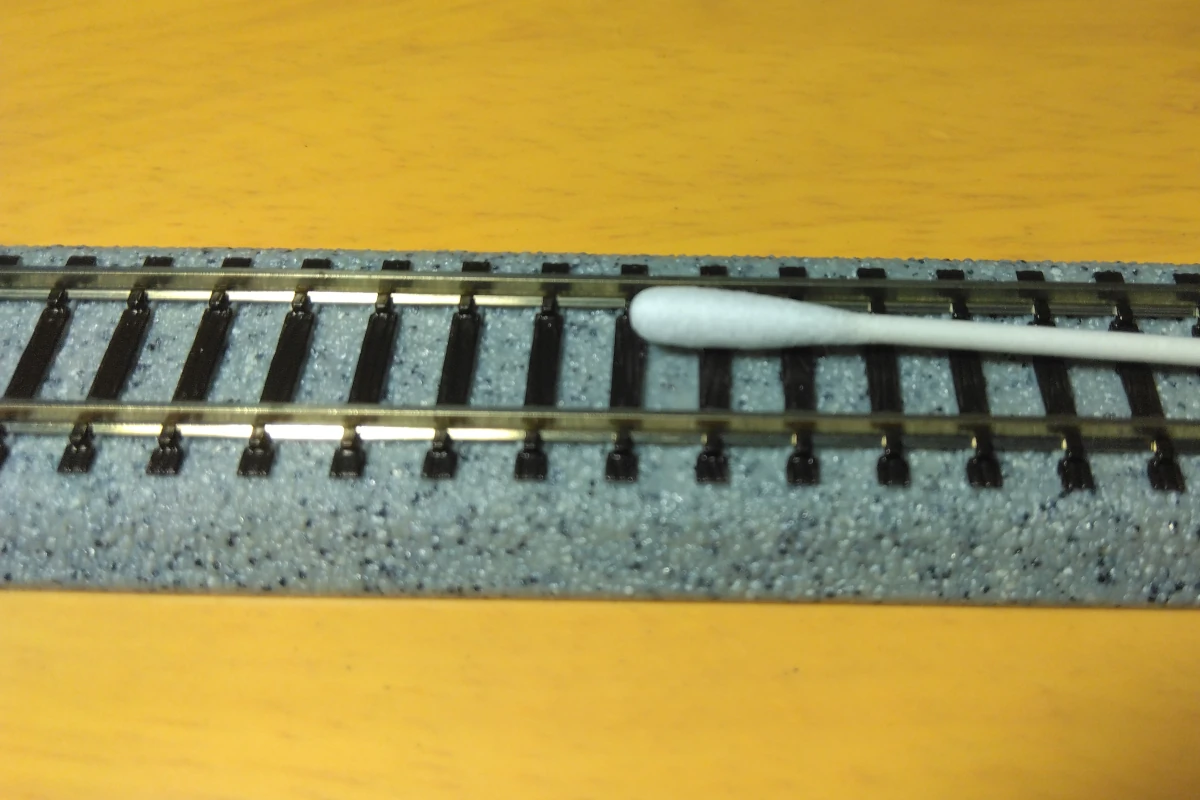 ・線路のメンテナンスは、綿棒を使って線路の内側に沿ったところををメインにむらなく清掃しましょう。走行に支障が出た状態や、年月が経った状態では綿棒に鉄道模型用クリーナーをしみ込ませてから清掃しましょう。